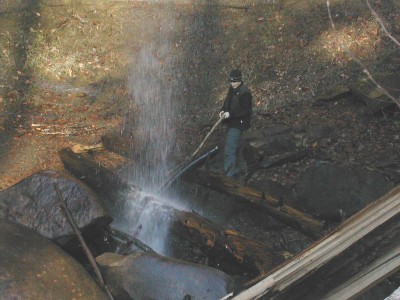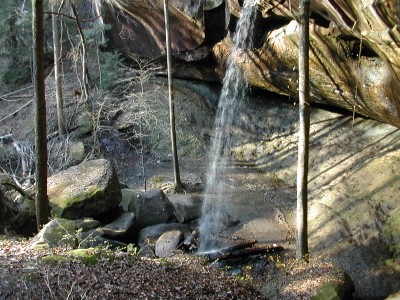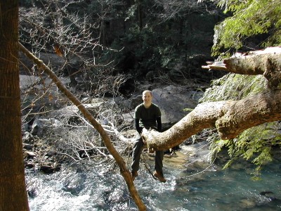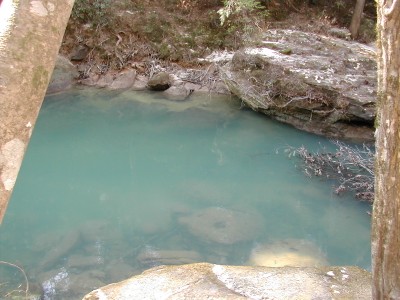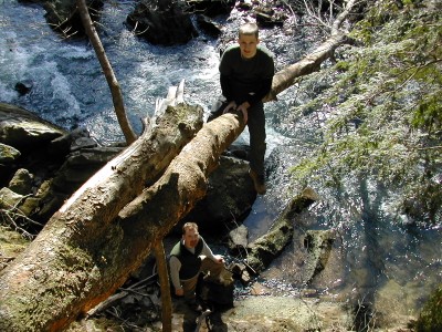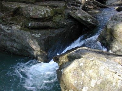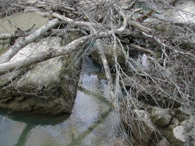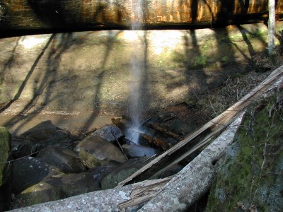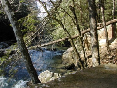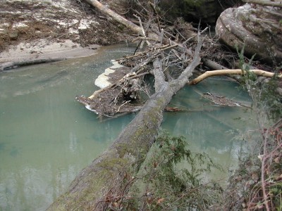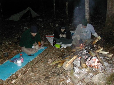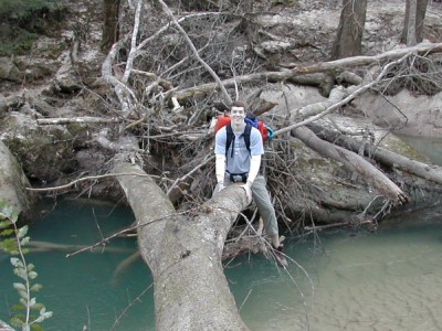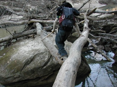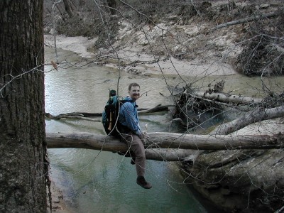 Hurricane Ivan did not pass this place untouched. There are downed trees everywhere. (lots of firewood!) We used several trees to cross the Sipsey, which was noticeably wider than in August. Tim and John walked across the trees, while Trey and I decided to scoot and crawl. Tim and John brought their Gameboys for some fireside Zelda. John made himself a very interesting latrine (ask him about it). I got dehydrated on Sunday morning, maybe even a little heat exhaustion. Overall, we had a good time and no one lost their ring! |