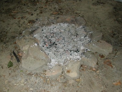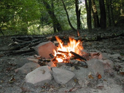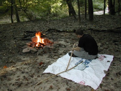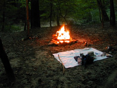 Tim threw my wedding ring in the Sipsey River. After hiking about 2 miles, Tim and I decided to take a break. He made a comment about his hands swelling and his ring cutting in to him. He said he should have went with the comfort fit. My ring is a comfort fit, so I took it off to show him. Tim decided he would just carry his ring on his index finger and I told him it would slide off. To prove his point, he acted as though he was going to throw the rings in the water. Well, his stayed on but mine didn't. We immediately started looking for it. The water wasn't much more than 2 feet deep, but it was nasty. We ended up stopping because the water clouded over and waited until dark to try again. While looking that night, I told Tim a metal detector might work. The next morning Tim hiked out on the search for a metal detector. He had to drive all the way to Decatur and back to get one. We found a beer can on the first try and the ring on the second. Neither of us felt like hiking, so we collected some wood and had a nice fire. |