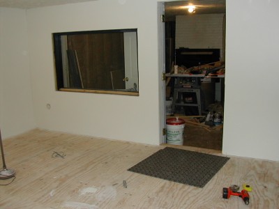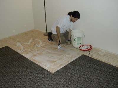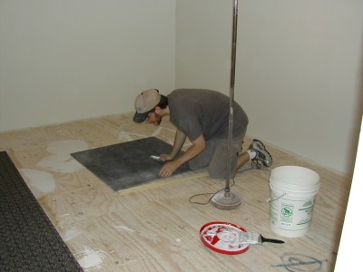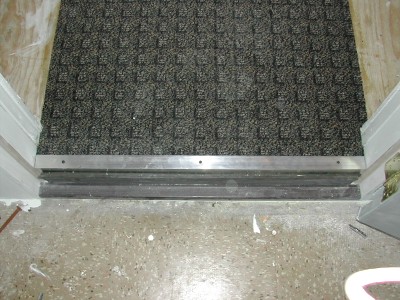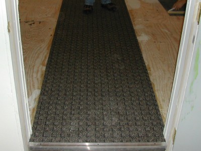 | The carpet was installed on Sunday, August 1, 2004. Installation was pretty easy. We started with the door jam because it will receive the most abuse. A piece of 3/16 inch angled aluminum was used as a kick plate. Richard cut all of the carpet while Jeremy and Jeff applied the glue and set the carpet. The carpet was a freebie from a retail store that had extra during a conversion. |