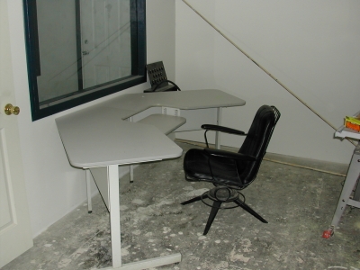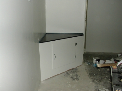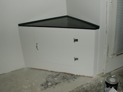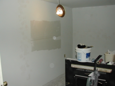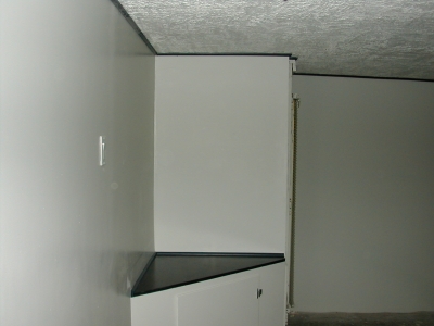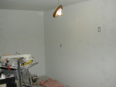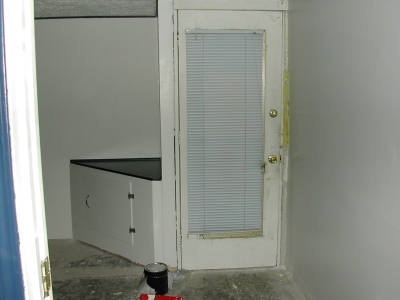 | Jeremy did most of the finishing work in this room himself. He added texture to the ceiling to match the live room. Big thanks to Anna for helping with the prime and paint. Jeremy and his father filled the hole left by the chimney with some quikrete. Jeremy and Raz built the cabinet to add a little storage to the room and to cover the old bricks. We still plan on replacing the side door, but haven't got to it yet. Once the room started coming together, it didn't take long to finish. |