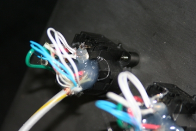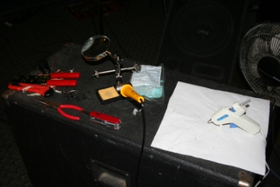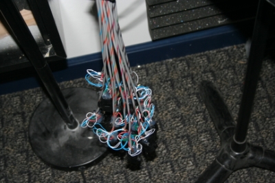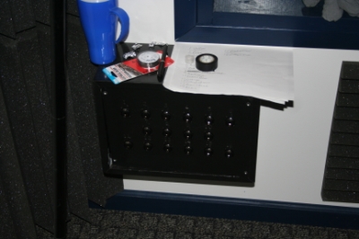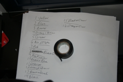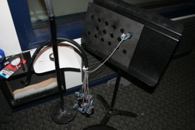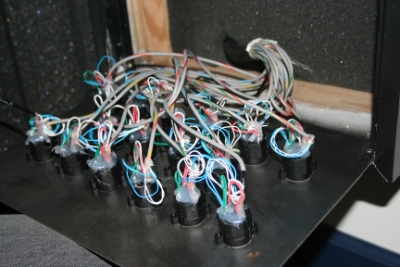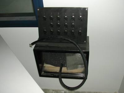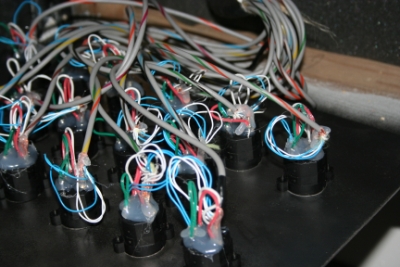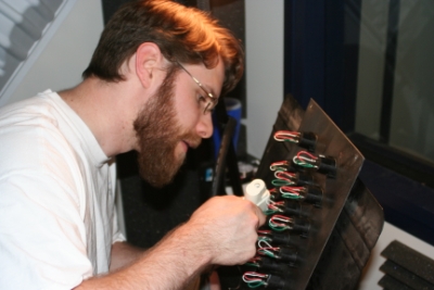| The wiring was one of the last pieces to actually being able to record in the studio. It took one full evening for Richard to complete, once Jeremy had the boxes and connector plates built. We decided on 16 connectors because our recording unit supported 8 XLRs and we knew we wanted more for headphones and such. We used a 25ft section of 16 channel snake cable and Neutrik combo XLR/quarter inch connectors. |